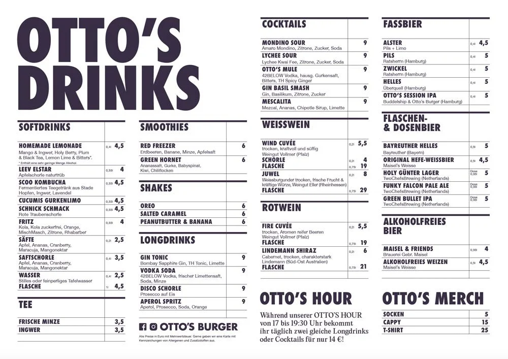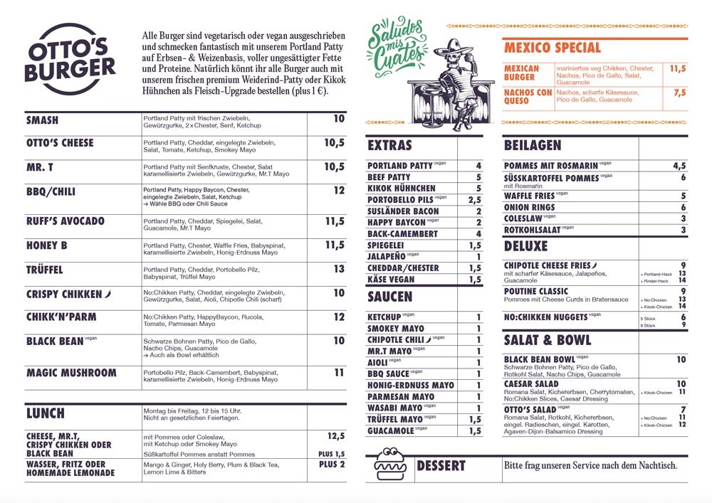 Bei Otto’s servieren wir dir saftigste premium Burger vom Feinsten aus knackfrischen Zutaten, mit oder ohne Fleisch. Abgerundet mit knusprigen Pommes und hausgemachten Saucen ist Otto’s der beste Freund deiner Seele und Lebensretter - nicht nur an grauen Tagen. Die Gemütlichkeit unserer Läden und offenen Herzen unserer Mitarbeiter laden zum Verweilen ein. Und jetzt kommt essen!